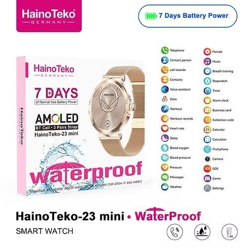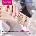 Haino Teko-23 Mini Waterproof شاشة AMOLED عالية الدقة بمقاس 1,35mm.مع هيكل الساعة مصنوع من الألمونيوم.الساعة متوافقة مع أجهزة Android و iOS.مقاومة للماء تحت عمق 1متر بحد أقصى 30 دقيقة طبقاً لوصف الشركة المصنعة.تدعم Always On Display.تدعم اللغة العربية – عمل باسورد للساعة.استقبال الإشعارات بلغة عربية سليمة.إجراء و استقبال المكالمات مباشرة من الساعة.إهتزاز للرسائل – نغمة للرنين.تدعم الساعة وضع توفير الطاقة – وضع عدم الإزعاج.